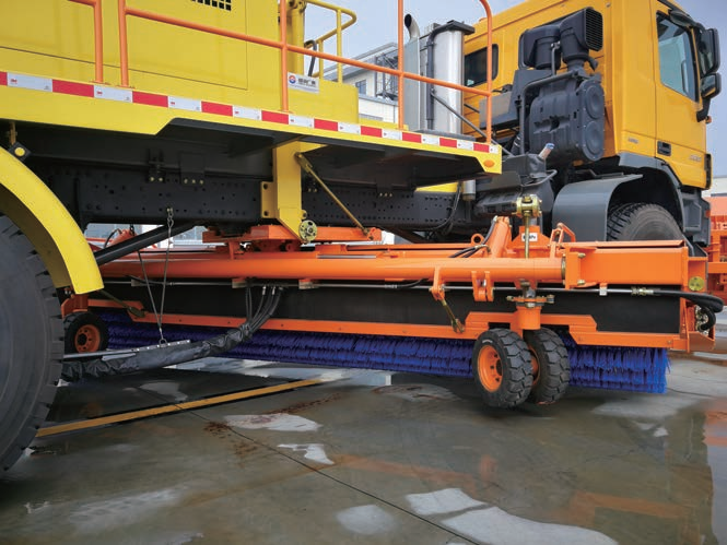 该类设备是通过向机场跑道及机场作业区的道面喷洒防(除)冰液,来达到使机场道面不结冰的目的,进而保障机场的正常使用。主要由汽车底盘、液路系统、液压系统、电气控制系统、摆臂系统、液罐系统等组成。
